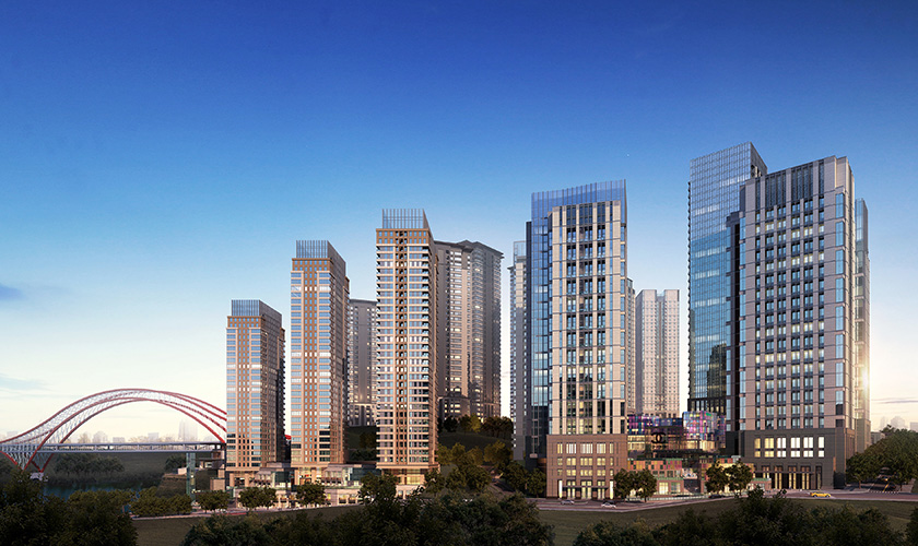 星耀天地項(xiàng)目位于重慶市江北區(qū)北濱二路,包括2棟高層辦公樓,3棟高層住宅及7棟多層辦公樓及商業(yè)和車庫,總建筑面積約230000㎡,為現(xiàn)澆框架剪力墻結(jié)構(gòu),最高建筑高度為99.4米。